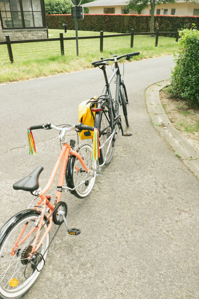 Ensuite, il y a 2 ans, j’ai fait l’acquisition d’un vélo suiveur simple. Un concept assez basique qui peut se résumer par : « un demi vélo enfant attaché au tube de selle du vélo adulte ». Bref, je vous mets une photo pour vous rendre compte de ce que c’est.