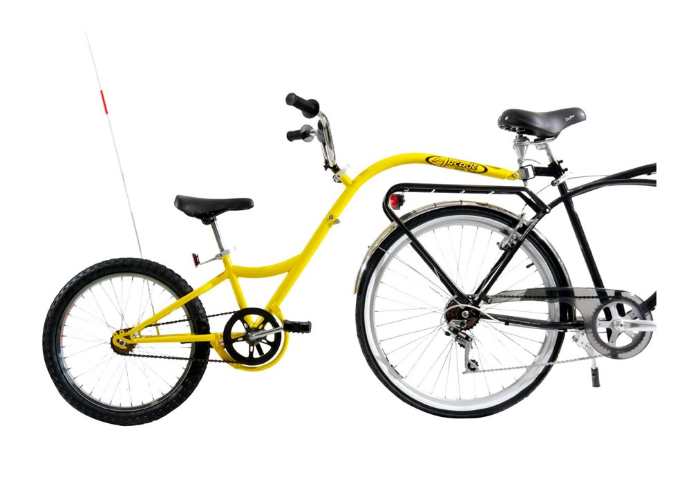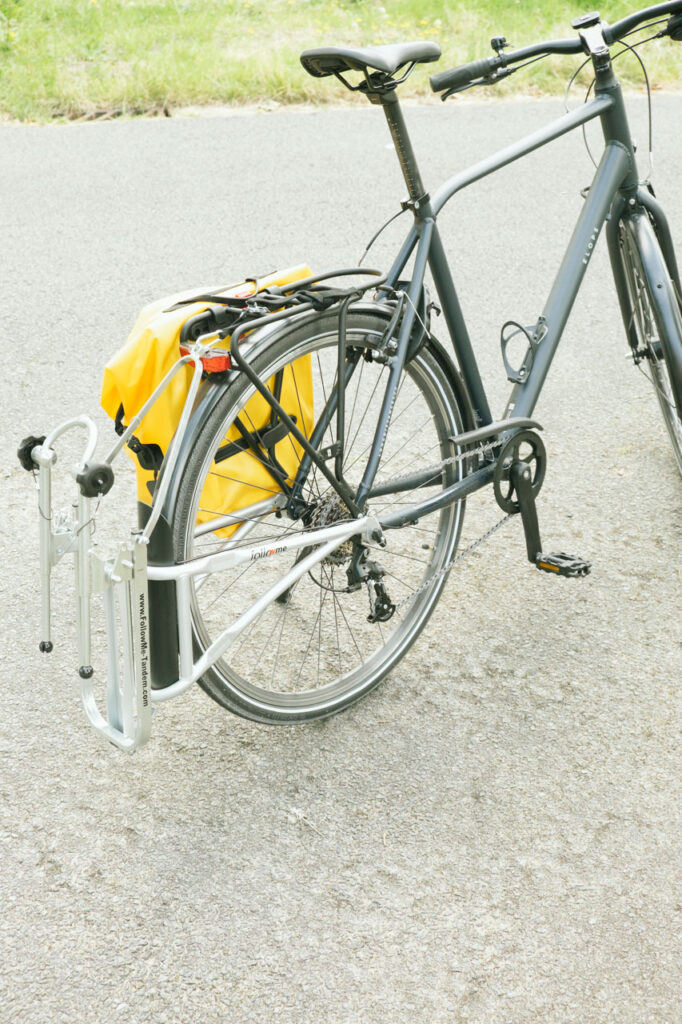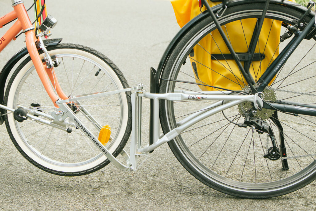 Le FollowMe est un dispositif de traction qui permet de « fixer » un vélo enfant à un vélo adulte en transformant les 2 en une sorte de Tandem.