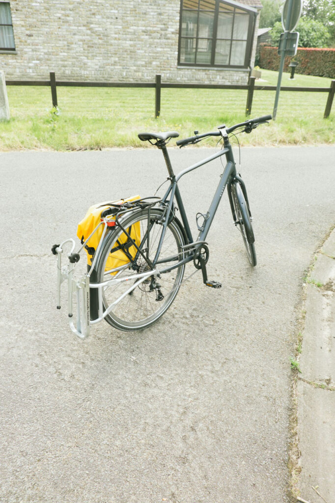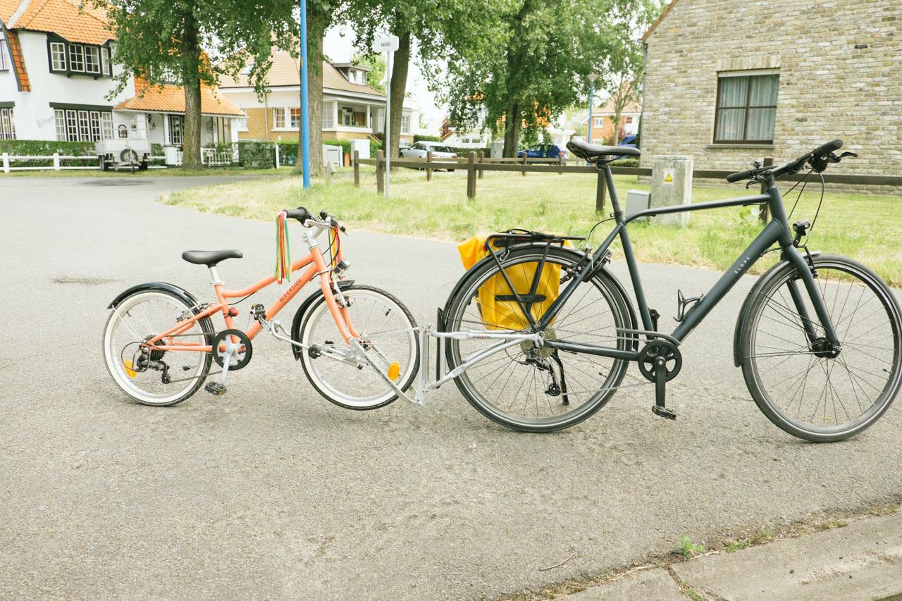 Ce qui m’a séduit dans ce système, c’est la possibilité d’attacher et de détacher facilement le vélo de Salomé du mien. On peut partir en promenade sans se soucier du nombre de kilomètres et dès qu’elle n’en peut plus (ou plutôt dès que je décide qu’elle n’en peut plus car si je l’écoute, après 300 mètres, elle n’en peut déjà plus), je peux fixer son vélo au mien et on continue la ballade tranquille. Et le reste du temps, le FollowMe est replié sur mon vélo près à être utilisé.