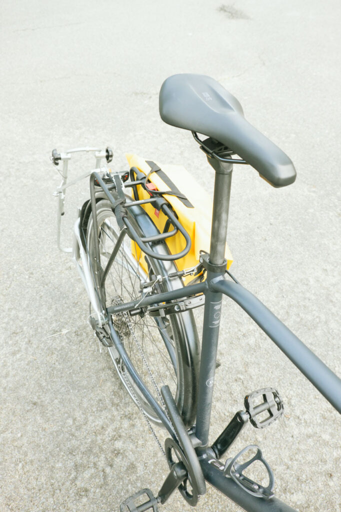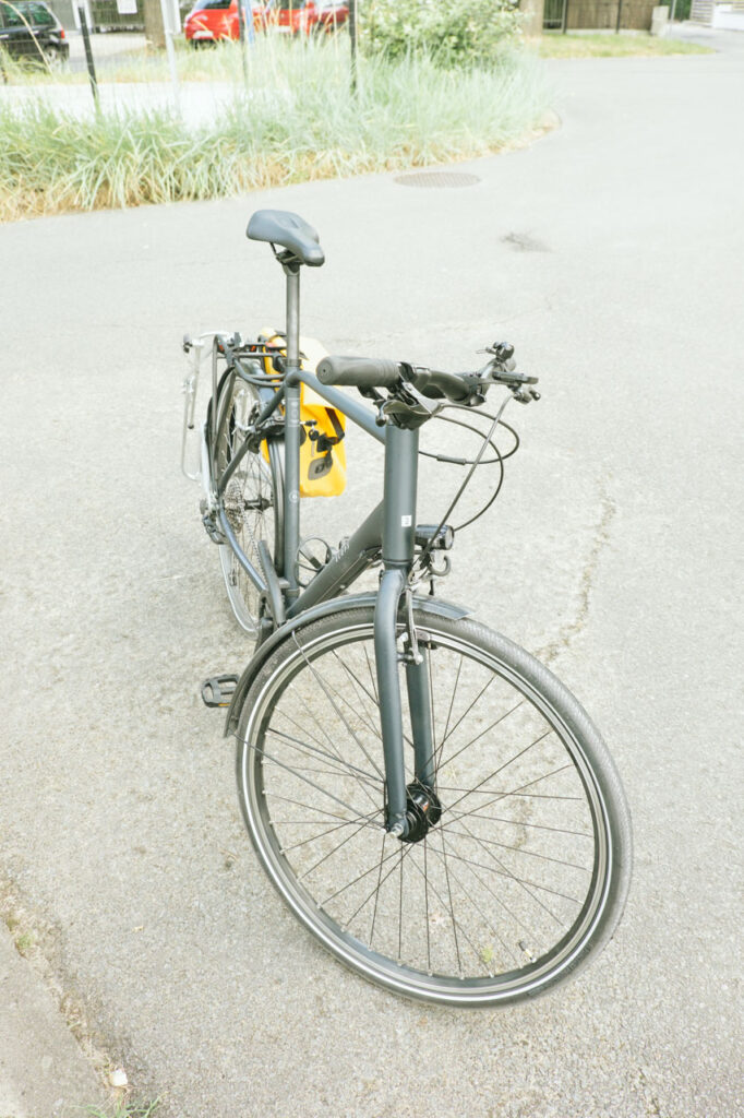 Je voulais un vélo orienté déplacement et confort. Avec un cadre haut, un guidon haut (pour une position assez droite, et pas une position « course ») et avec des équipements intégrés pour route et le transport : éclairage avant, arrière, porte-bagage à l’arrière (avec une belle petite sacoche pour aller faire nos courses en vélo).